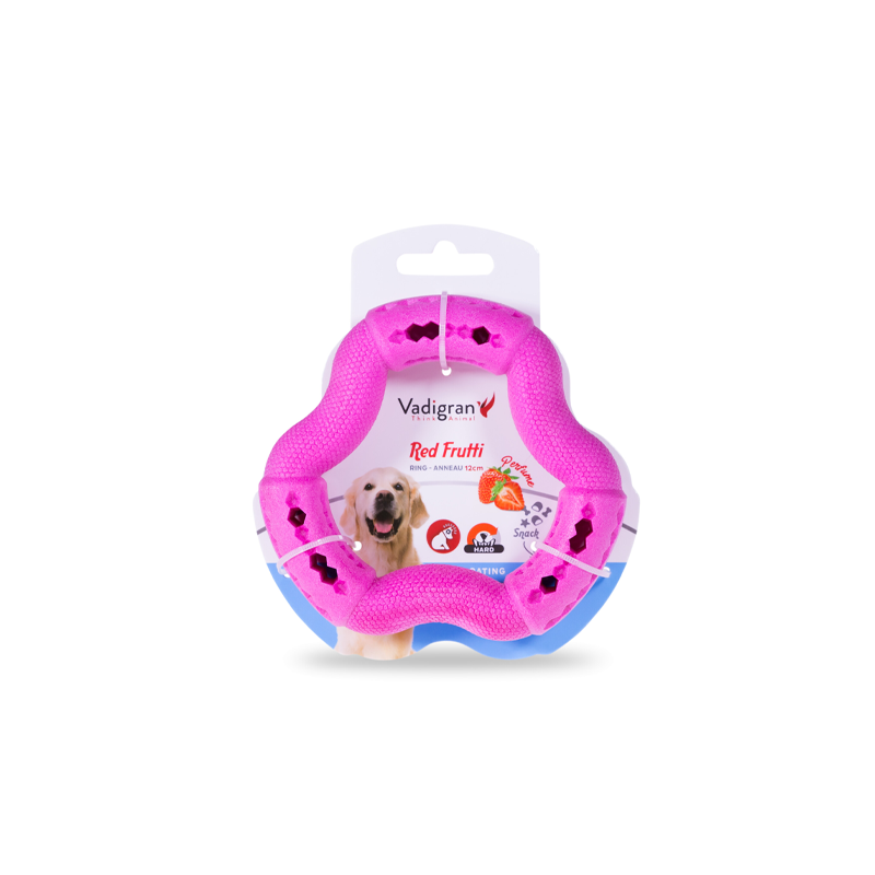 Jouet en caoutchouc thermoplastique (TPR). Solide et résistant. En plus d'être très robuste, ce jouet va être très attractif pour le chien grâce au délicieux parfum de fraise qu'il possède.