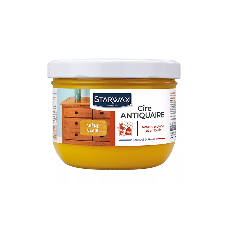 La Cire antiquaire embellit, nourrit et protège les meubles anciens ou modernes en bois, Elle met en valeur le veinage, atténue les griffures et rayures, Elle rehausse légèrement le ton du support pour entretenir la teinte, La cire antiquaire assure la conservation du bois et lui donne une belle patine, Formulée à l'ancienne à base de térébenthine et de cire d'abeilles.