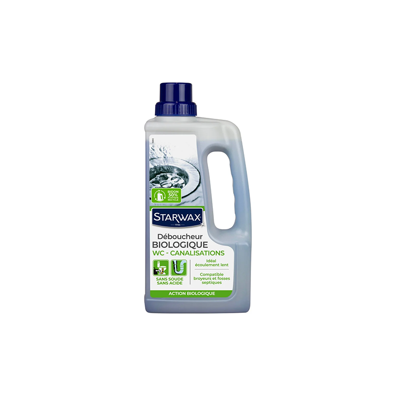 Sans acide, sans soude, le Déboucheur biologique Starwax contient des micro-organismes et des enzymes qui détruisent par action biologique les déchets organiques (savon, graisse, aliments…) à l’origine du bouchon et des odeurs.