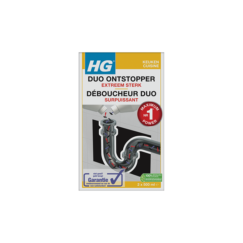 HG déboucheur duo 2x 0,5L est un déboucheur qui a été conçu pour éliminer les bouchons les plus tenaces dans l’évacuation des éviers ou lavabos. Dorénavant, plus besoin d’appeler le plombier! Dans la cuisine, les bouchons sont souvent causés par la graisse et les restes alimentaires. Dans la salle de bain, ils le sont par le dentifrice, les cheveux, les restes de savon et le sébum.