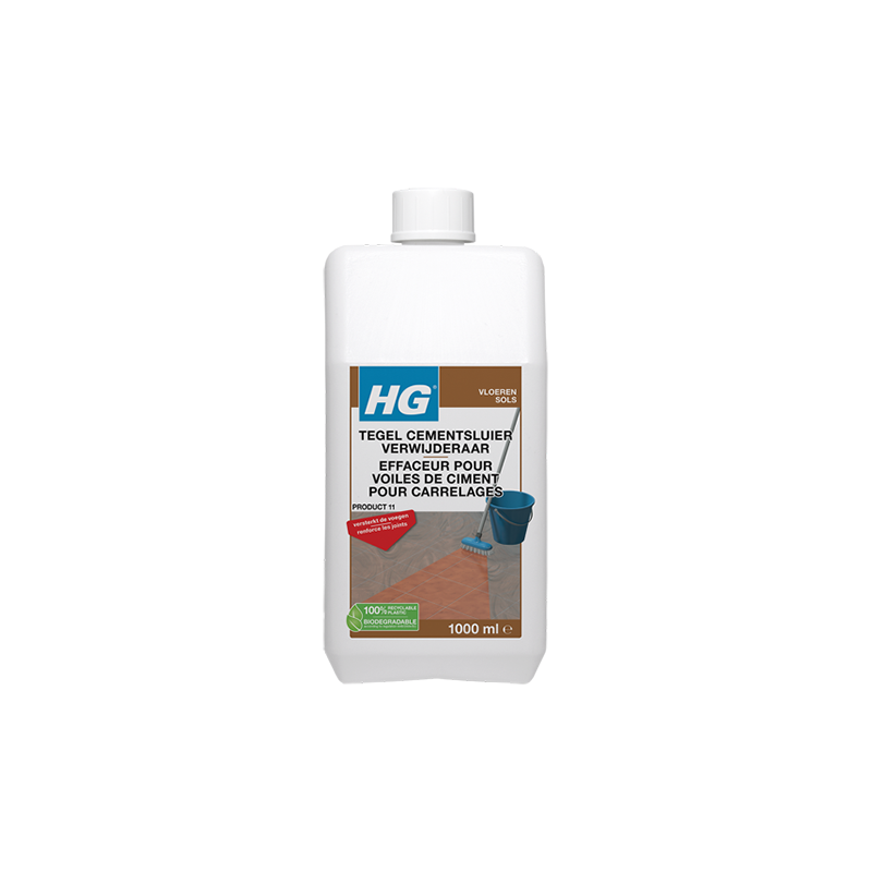 HG effaceur pour voiles de ciment pour carrelages 1L est un produit voile de ciment qui enlève le voile de ciment de tous les types de carreaux céramiques, tomettes, pierres naturelles non calcaires telles que l’ardoise norvégienne, le granit et le quartzite, qu’ils soient poreux ou non.
