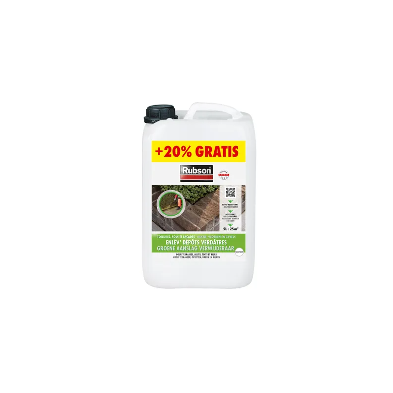 Rubson Enlèv'Dépôts Verdâtres enlève tous les types de salissures verdâtres sur des supports durs comme e.a.: ardoises, shingles, roofing, polyester, clinkers, carrelages, béton, bois, brique, ciment, céramique, pierre, chaux, cuivre, matières synthétiques, toitures en bitume, plâtre de parement, etc. Autres domaines d'applications: murs, sols, toitures, gouttières, allées, clôtures, terrasses, statues, pierres tombales, balcons, ...