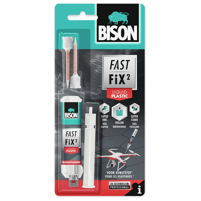 Bison Fast Fix² Plastic 10G Blister fixe et répare en quelques secondes (environ 60 secondes selon les matériaux, l’humidité et la température) de nombreux plastiques comme le PVC, le polystyrène, le polycarbonate, l'ABS et le PMMA ensemble et avec beaucoup d'autres matériaux tels que le bois, la céramique, la pierre, le caoutchouc et le verre (tester au préalable).