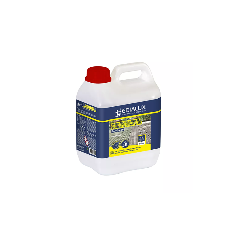 For-Green 2,5L détruit les dépôts verts (ou algues) sans problème. Ils rendent les sentiers et les allées dangereusement glissants par temps pluvieux. Produit à diluer dans l'eau.