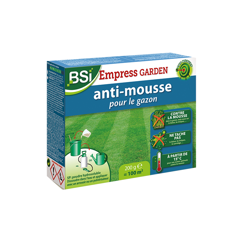 Empress est un anti-mousse efficace pour lutter contre les mousses dans les gazons, les pelouses et sur certains terrains revêtus non cultivables en gravier ou béton foncé (dalles/ pavés en béton).
