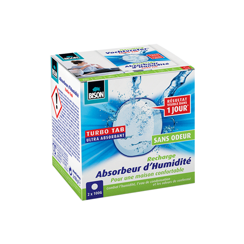Bison Absorbeur d'Humidité Tab Turbo 100g neutre lutte contre l'humidité dans tous les espaces de vie. Convient parfaitement pour la salle de séjour, la chambre à coucher, la salle de bains, les toilettes, etc.