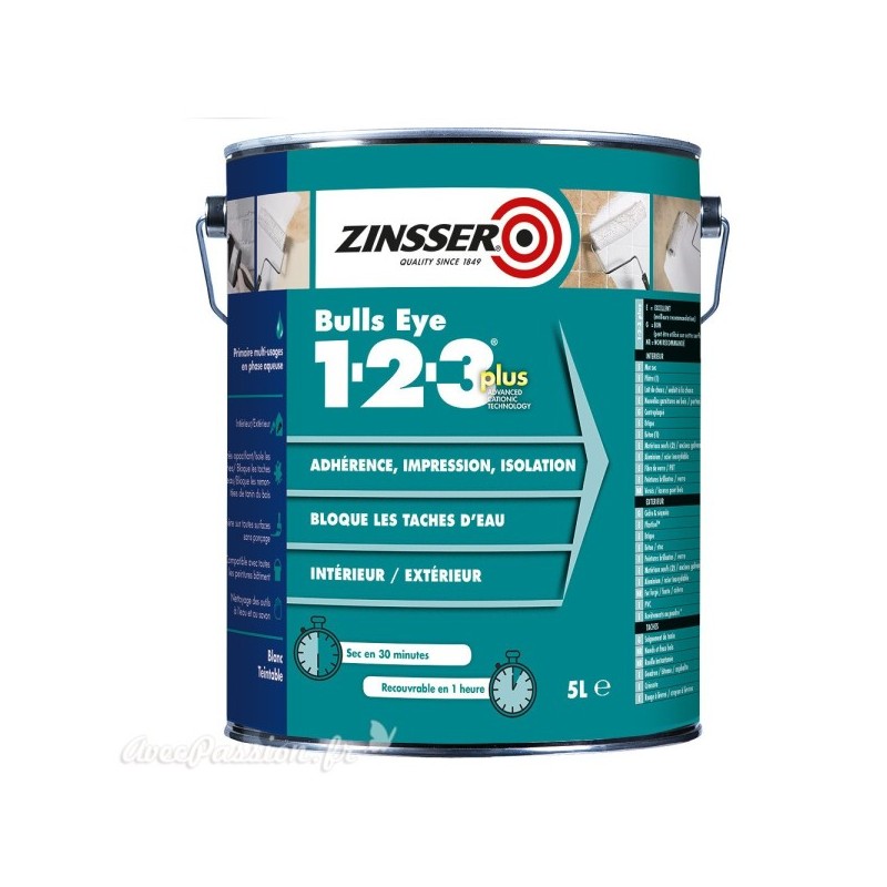 Primaire universel à base de résine ester d'époxy en phase aqueuse combinant séchage rapide et un excellent pouvoir masquant. Pour intérieur et extérieur. Bulls Eye 1-2-3 Plus isole la plupart des taches (même les taches d'eau et de suie), et adhère sur la plupart des supports sans pré-ponçage.
