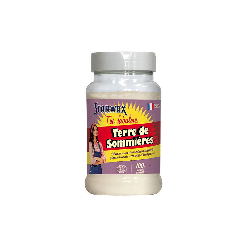 « The Fabulous Terre de Sommières » est une poudre d’argile extraite à l’origine dans la région de Montpellier depuis le XIXe siècle. Elle est reconnue pour ses propriétés ultra-absorbantes (jusqu’à 80% de son poids). Elle élimine les taches de gras sur les textiles les plus délicats et peut s’utiliser même après lavage en machine sur linge sec.