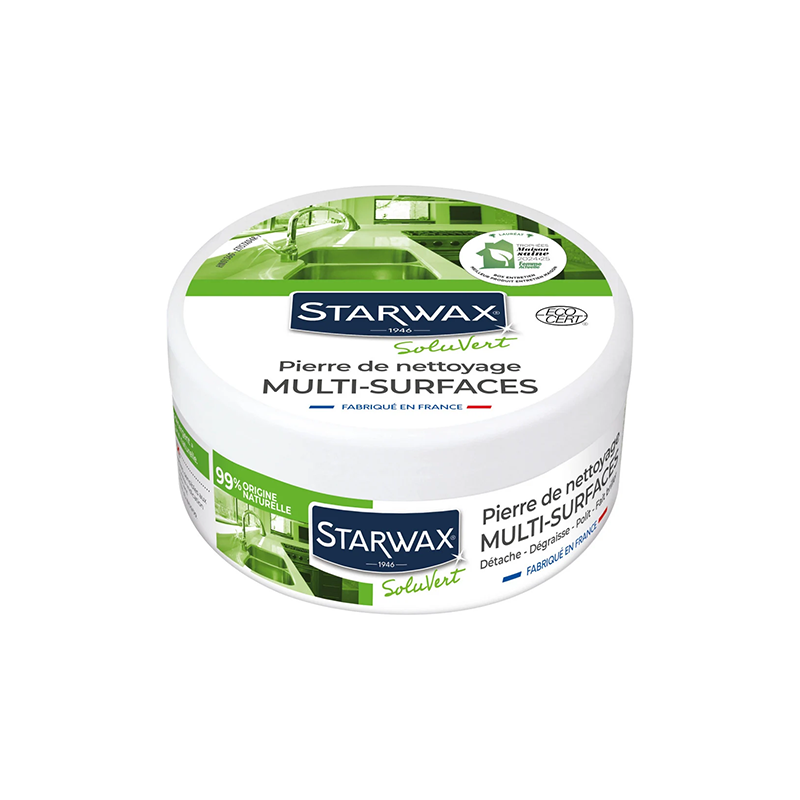 Légèrement abrasive et apte au contact alimentaire, la Pierre de nettoyage Starwax nettoie, décrasse, protège, et fait briller tous types de surfaces lavables en intérieur comme en extérieur :