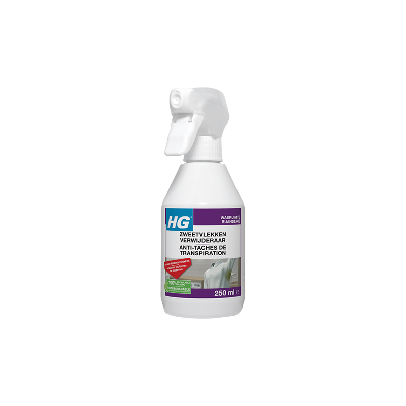 HG anti tâches de transpiration 0,25L est un détachant transpiration efficace pour le prétraitement des taches jaunes provoquées par la transpiration et les déodorants. Après un traitement avec notre détachant trace de déodorant, ces taches jaunes disparaissent.