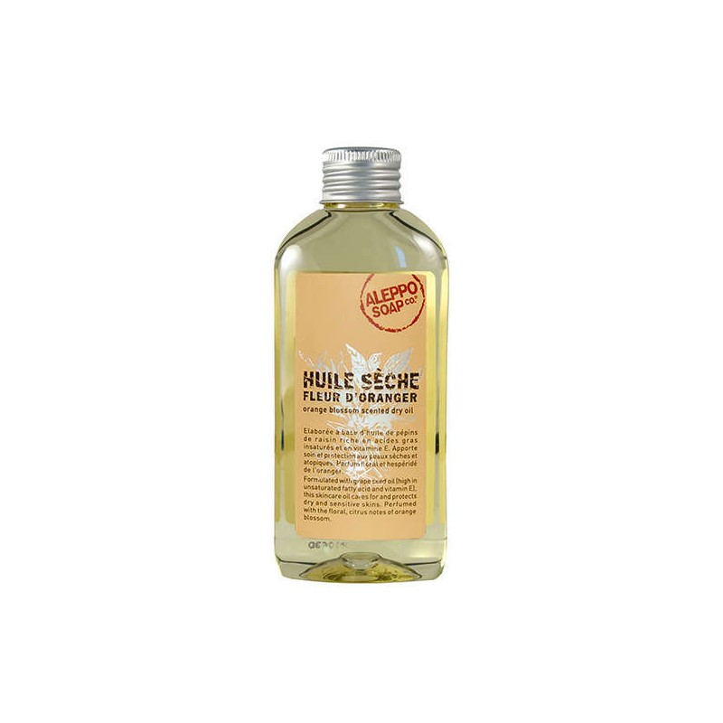 Une huile pour le corps à base de pépins de raisin et d'huile d'oranger biologique riche en acides gras insaturés et en vitamine E L'huile de fleur d'oranger à la fois apaisante et salvatrice.