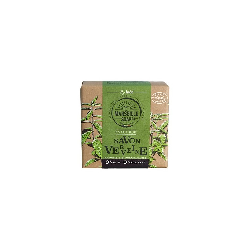 Savonnette de Marseille certifiée Cosmos, issue de la saponification au chaudron d'huile d'olive vierge, parfumée à la verveine.