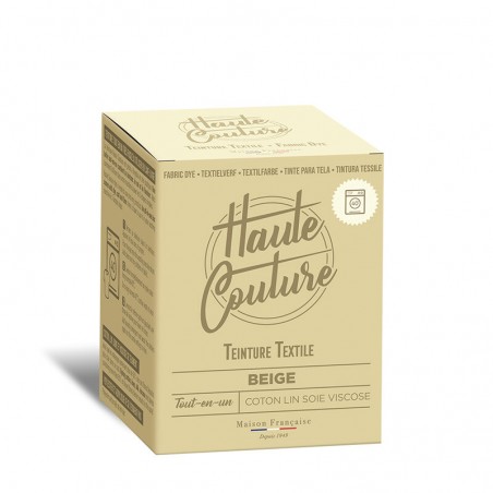 Teinture textile tout-en-un fabriquée en France, adaptée à la main ou en machine, pour un beige intense et longue tenue.