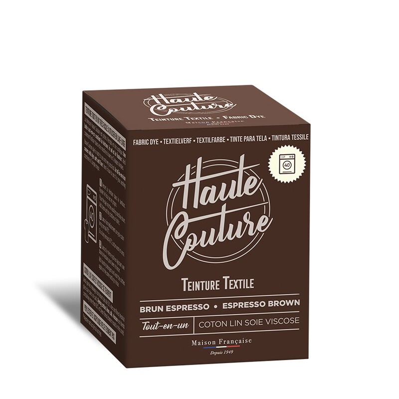 Teinture textile tout-en-un fabriquée en France, adaptée à la main ou en machine, pour un brun expresso intense et longue tenue.