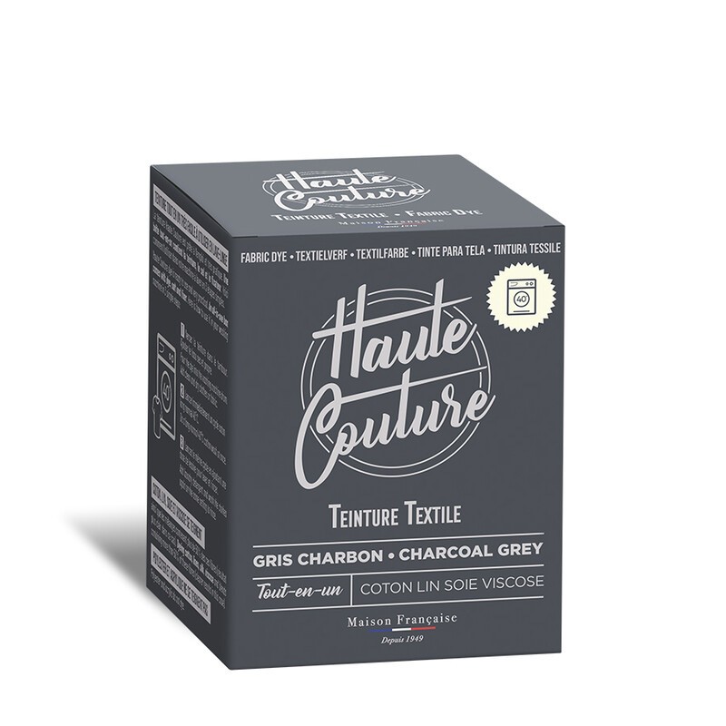 Teinture textile tout-en-un fabriquée en France, adaptée à la main ou en machine, pour un gris charbon intense et longue tenue.