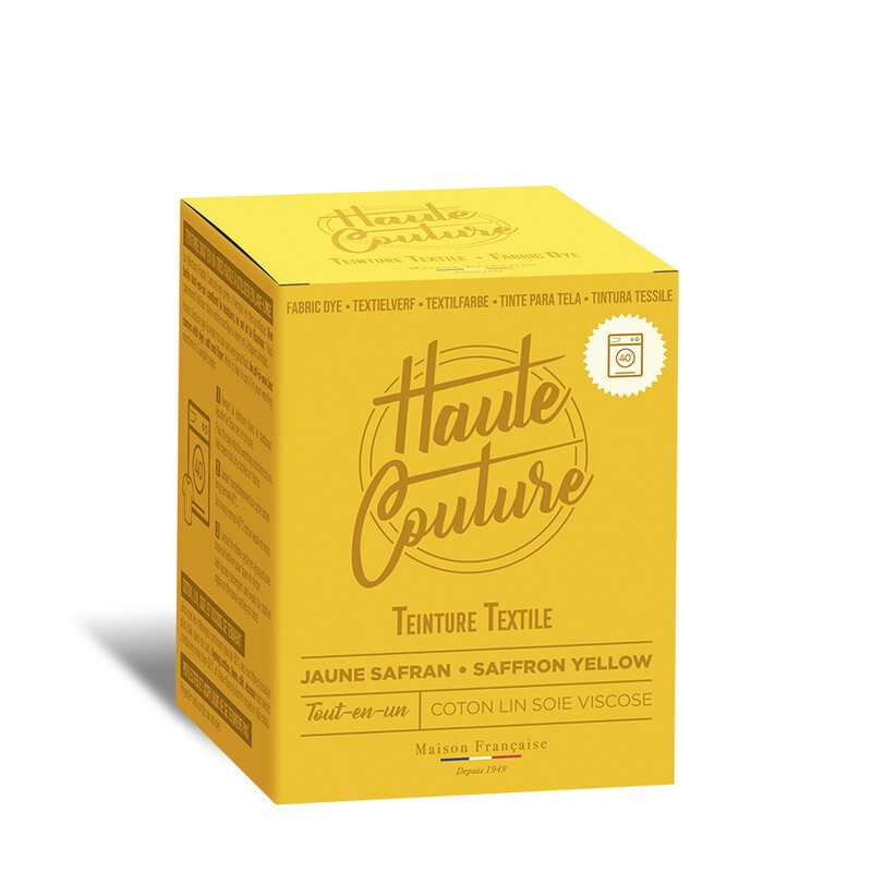Teinture textile tout-en-un fabriquée en France, adaptée à la main ou en machine, pour un jaune intense et longue tenue.