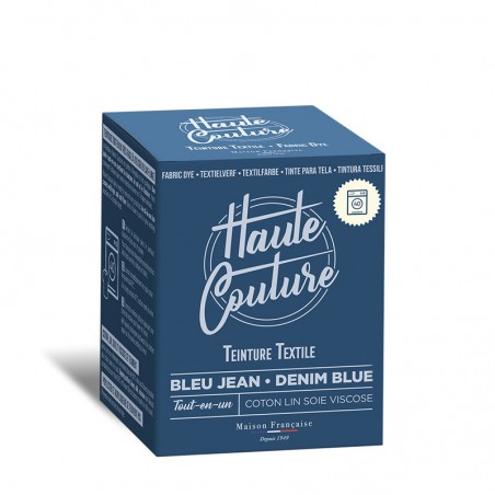 Teinture textile tout-en-un fabriquée en France, adaptée à la main ou en machine, pour un bleu jeans intense et longue tenue.