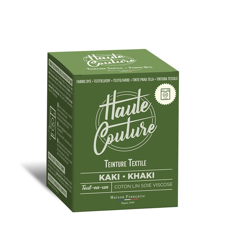 Teinture textile tout-en-un fabriquée en France, adaptée à la main ou en machine, pour un kaki intense et longue tenue.