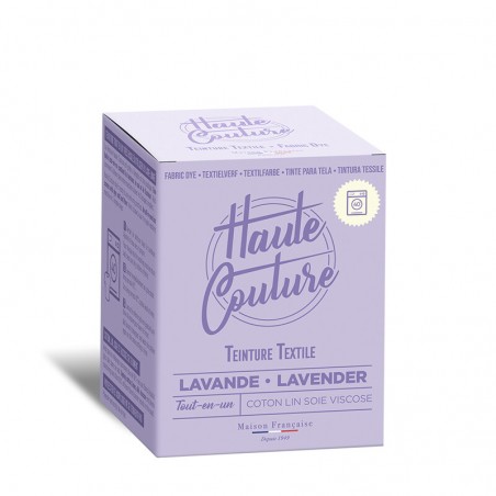 Teinture textile tout-en-un fabriquée en France, adaptée à la main ou en machine, pour un lavande intense et longue tenue.