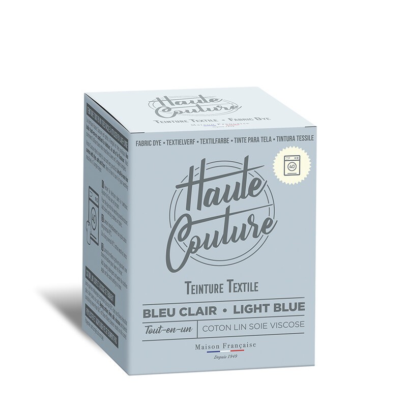 Teinture textile tout-en-un fabriquée en France, adaptée à la main ou en machine, pour un bleu clair longue tenue.