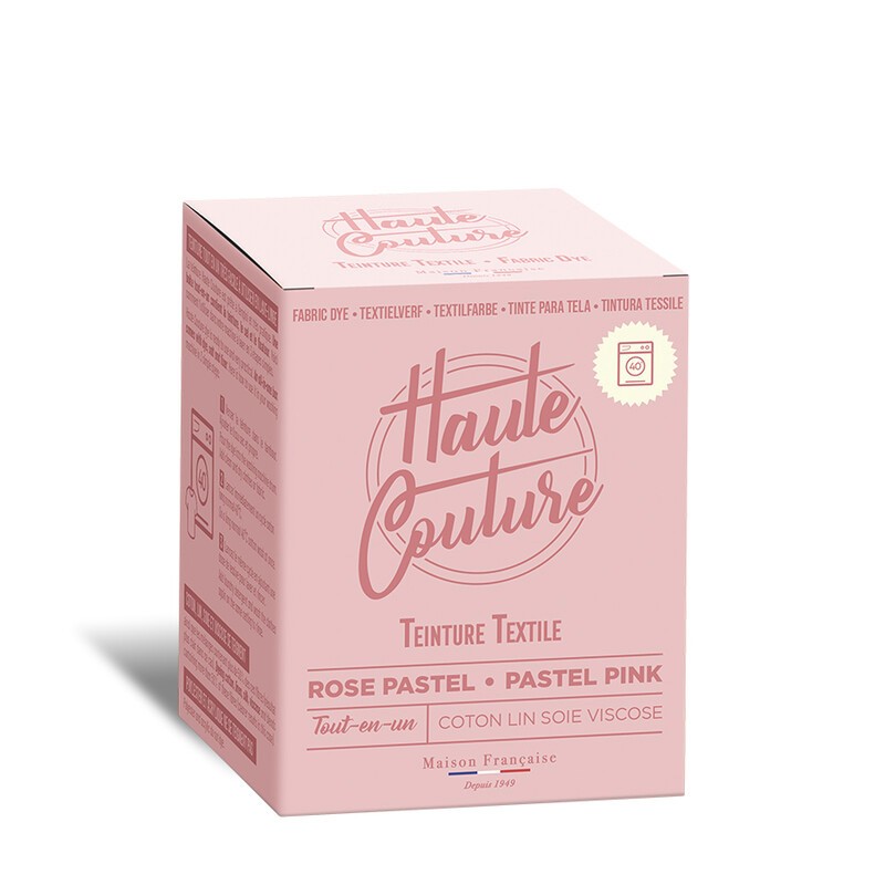 Teinture textile tout-en-un fabriquée en France, adaptée à la main ou en machine, pour un rose pastel intense et longue tenue.