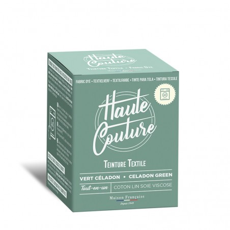 Teinture textile tout-en-un fabriquée en France, adaptée à la main ou en machine, pour un vert céladon intense et longue tenue.