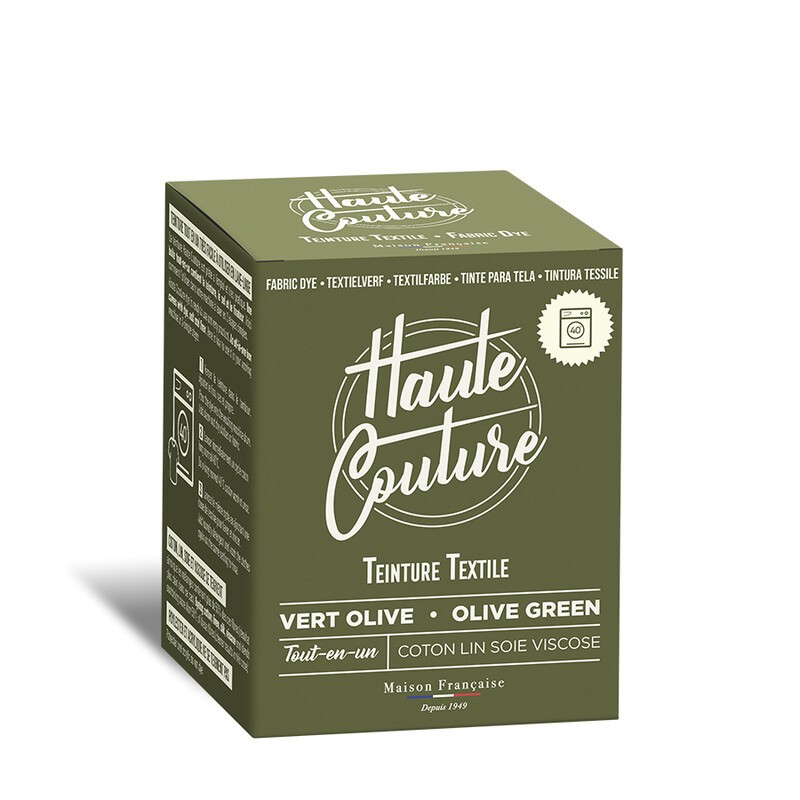 Teinture textile tout-en-un fabriquée en France, adaptée à la main ou en machine, pour un vert olive intense et longue tenue.