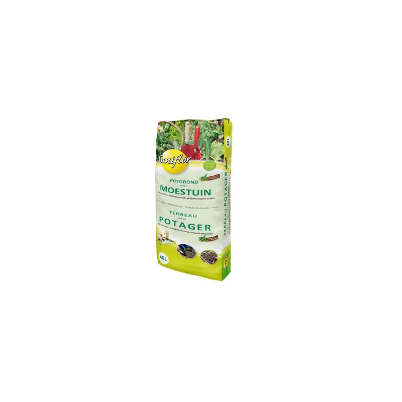 TERREAU POTAGER 40 L de Van Israel : Ce Terreau Potager sans tourbe SANIFLOR a pour constituant majeur de la fibre de coco, un élément très intéressant de par sa durabilité et ses nombreuses propriétés. le Terreau Potager SANIFLOR est un des meilleurs sur le marché actuel des terreaux écologiques sans tourbe et est bien évidemment utilisable en agriculture biologique.
