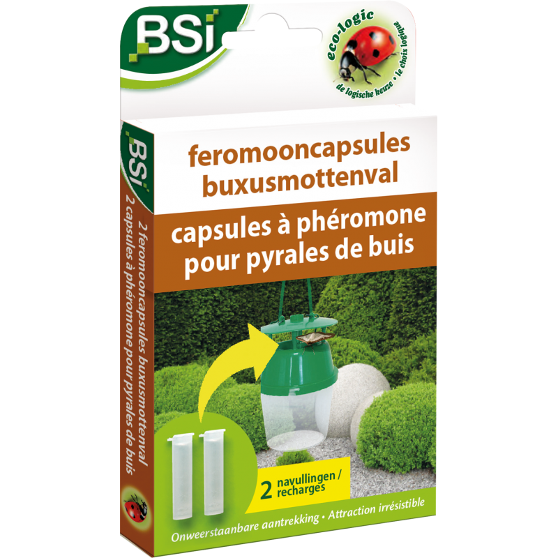 BSI Recharge Piège à Phéromones Pyrale du Buis 2-pack s'utilisent pour recharger les pièges à pyrale du buis. L'emballage comporte 2 capsules qui agissent pendant une durée de 3 mois.
