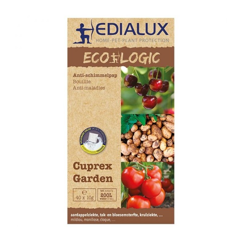Cuprex Garden a un effet de contact, ce qui signifie que la germination des champignons est évitée, ainsi que des dommages supplémentaires à la plante. Le produit est déjà pré-dosé dans des sachets hydrosolubles pratiques, sans poussières. Avec un traitement régulier, ce produit aura également un effet curatif.