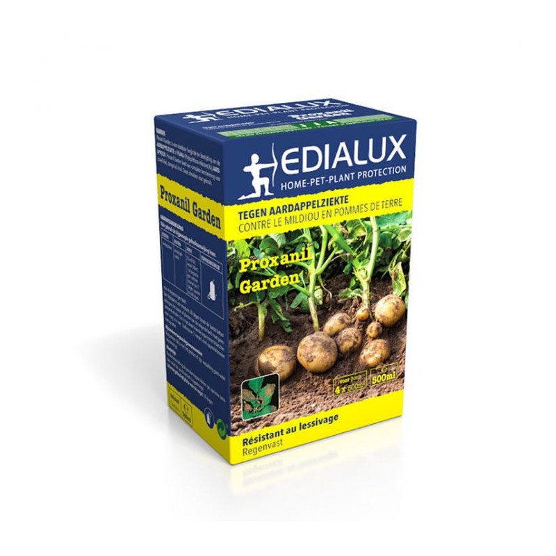 Proxanil Garden est un traitement contre le mildiou en pommes de terres. Le produit contient deux substances actives qui apportent au produit une excellente action préventive et curative. Les deux substances actives sont translaminaires. Cela signifie quelle produit se répand de façon locale dans le feuillage et agit sur différents points: le champignon dans la plante est inhibé et le développement de spores et des porteurs de spores est bloqué. Le produit est résistant à la pluie.